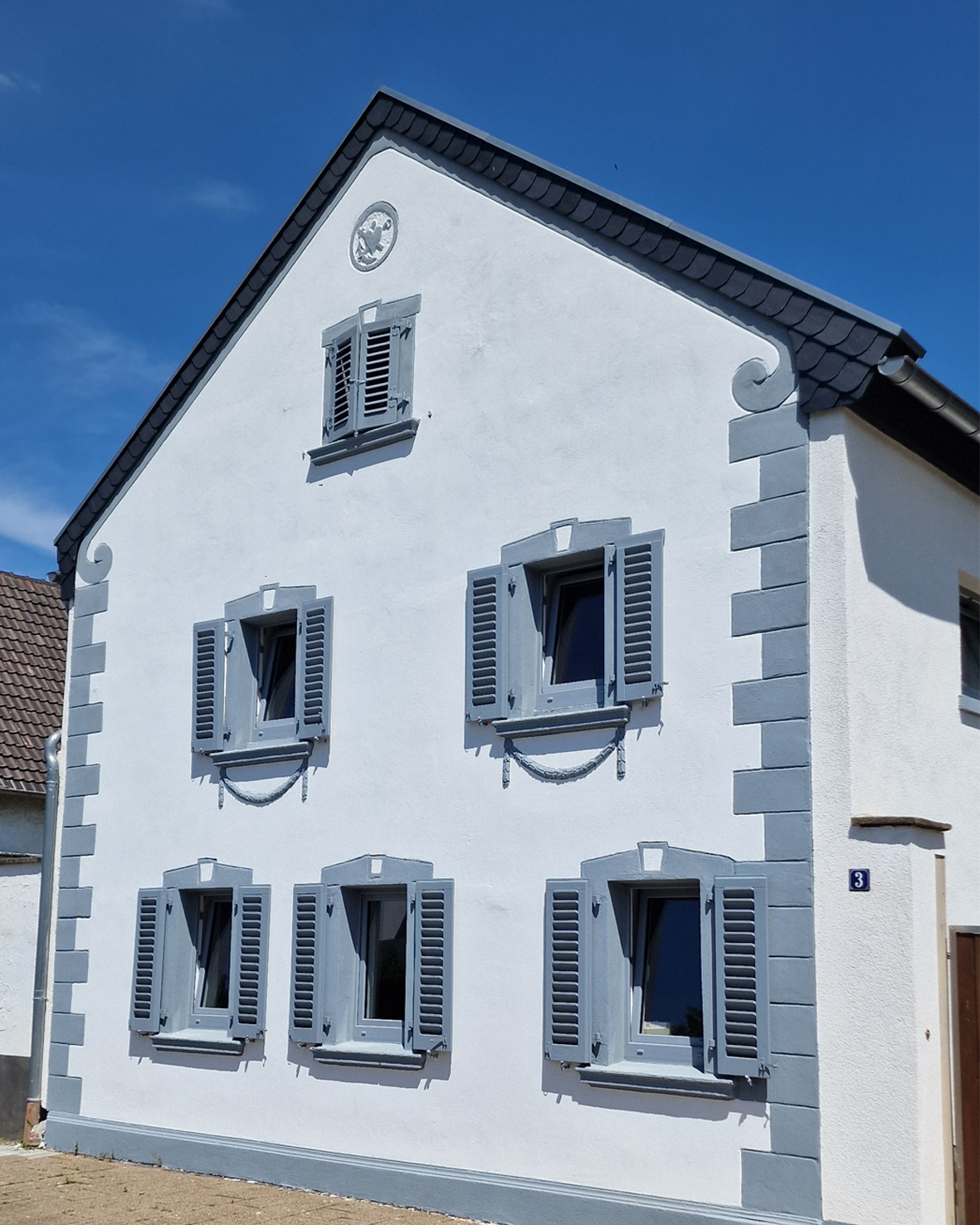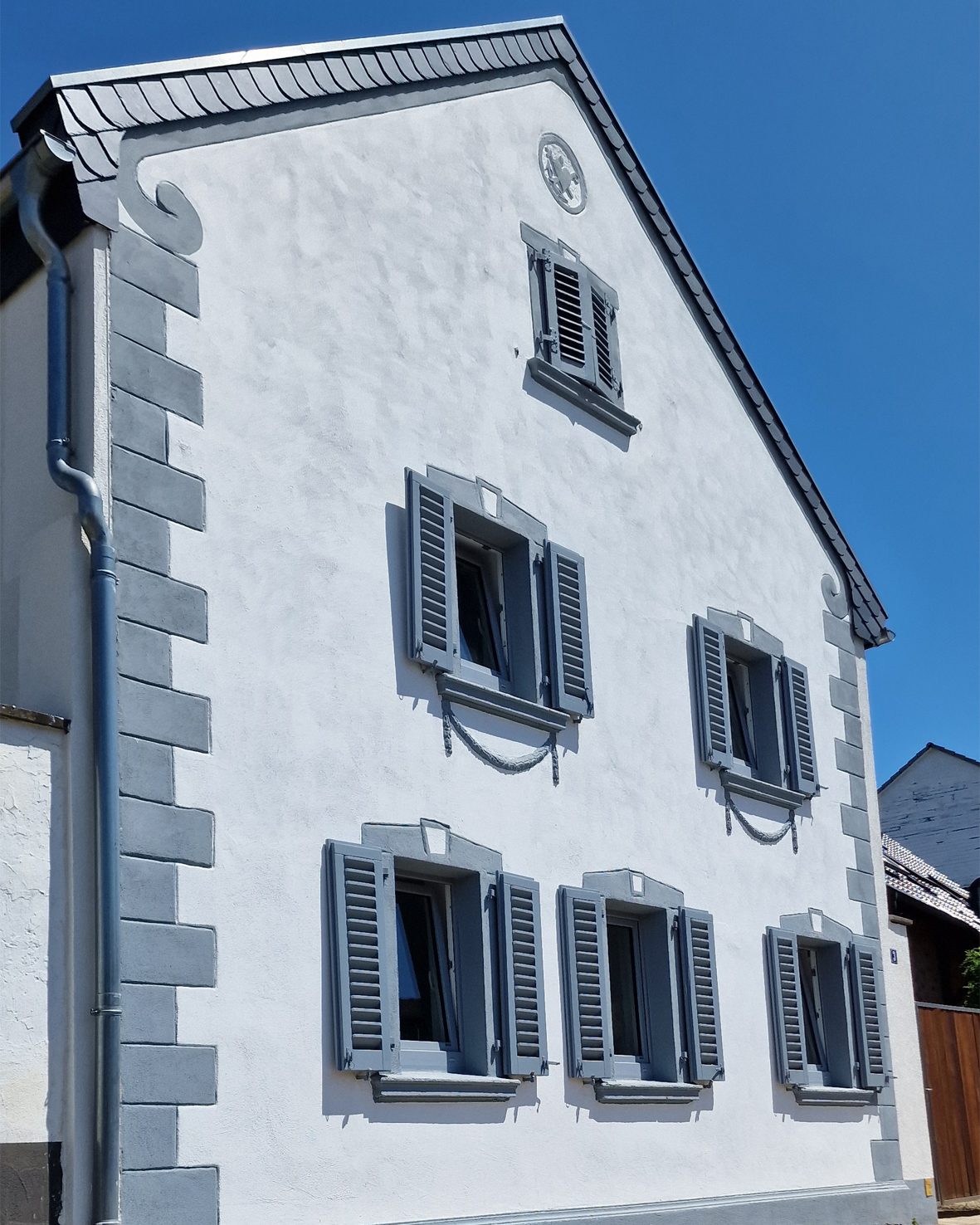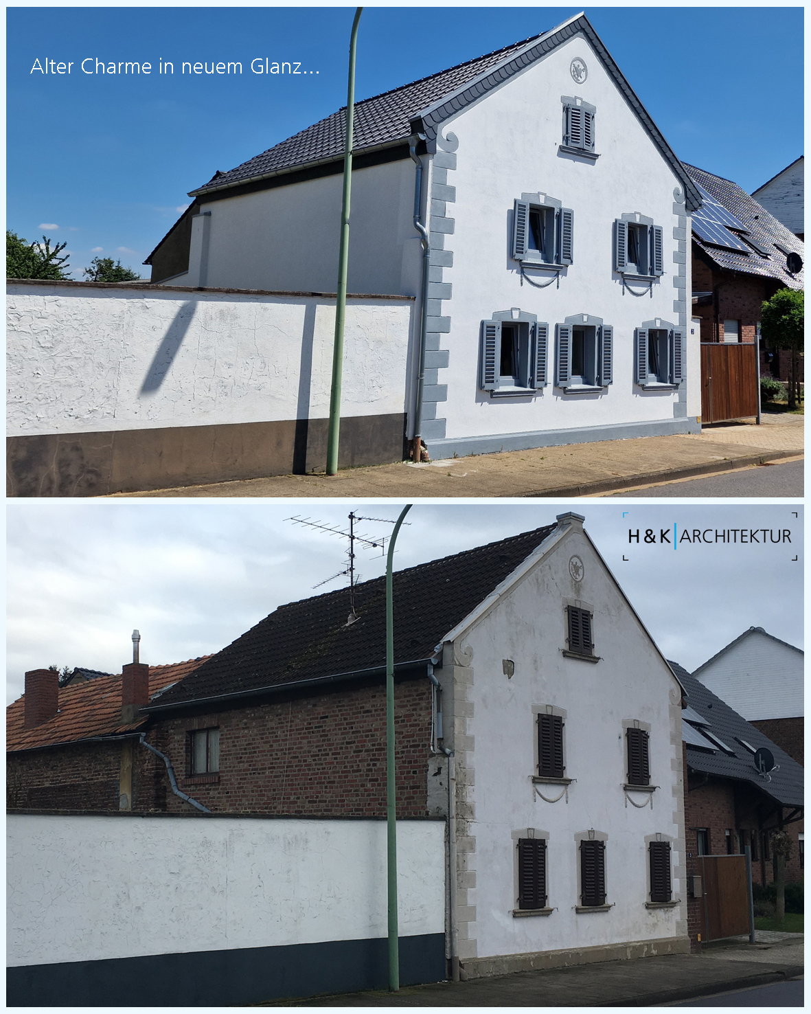 In der Gemeinde Nörvenich durften wir ein sehr schönes Projekt umsetzen. Ein kleines Wohnhaus mit angrenzenden Stallungen sollte modernisiert werden. Hierzu war ein Teilabriss der rückwärtigen Gebäude sowie die Neuerrichtung eines Anbaus erforderlich. Von Beginn an stand fest, dass die alte Stuckfassade mit hölzernen Fensterläden für dieses Gebäude absolut identitätsstiftend ist und somit auf jeden Fall erhalten bleiben muss. Nach Fertigstellung der Fassadenarbeiten sind wir mit dem Ergebnis sehr zufrieden.